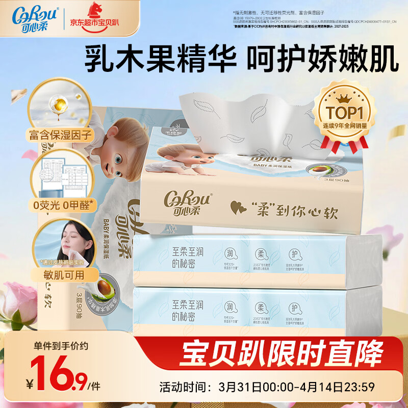 可心柔婴童乳霜纸3层90抽4包新生儿乳木果保湿柔纸巾