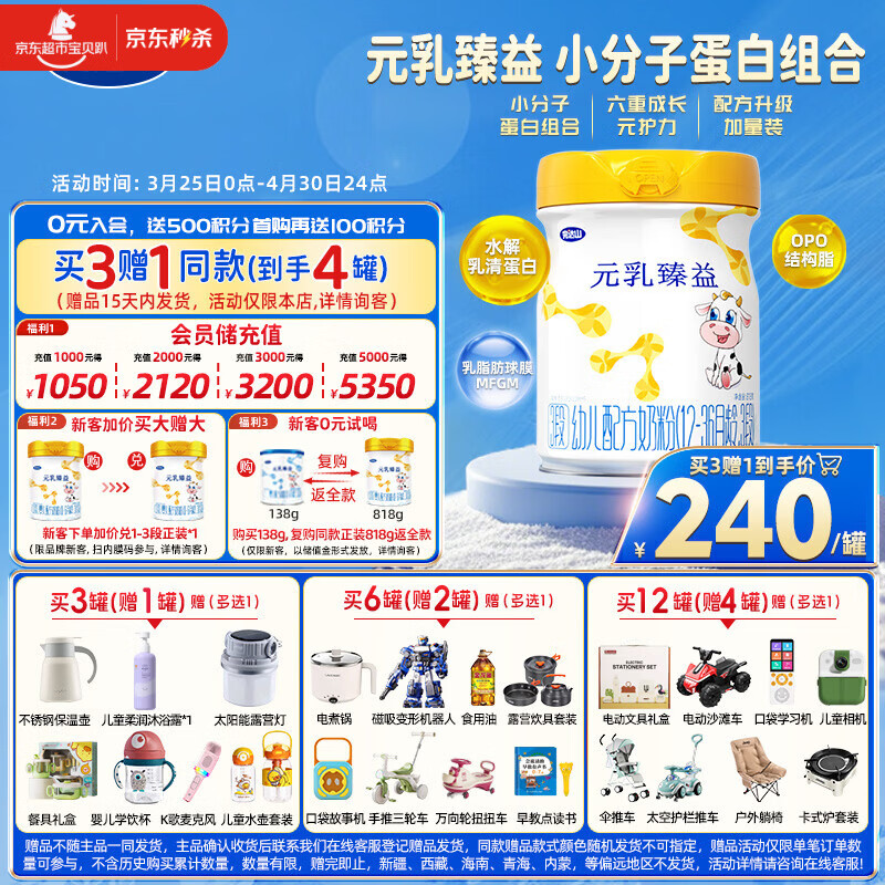 完达山元乳臻益幼儿配方奶粉3段818g(12-36个月)水解乳清蛋白乳脂肪球膜