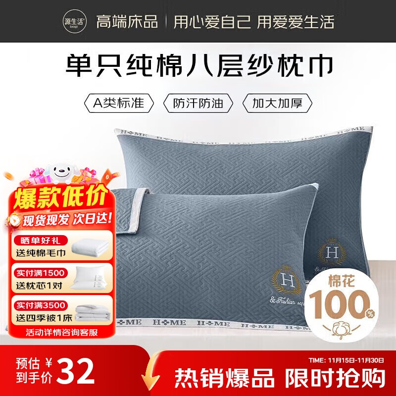 源生活100%纯棉A类八层纱枕巾 防油防脱落加厚枕头巾 单只蓝色50x80cm