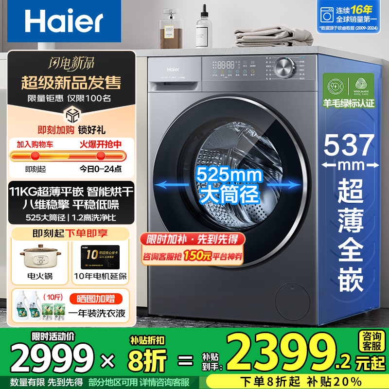 海尔(Haier)超越4.0系列11公斤58E洗衣机全自动滚筒大容量525大筒径 超薄平嵌 AI八维减震 一级能效 家电补贴 冲浪洗+智能烘干+AI八维减震+羊毛绿标+高洗净比