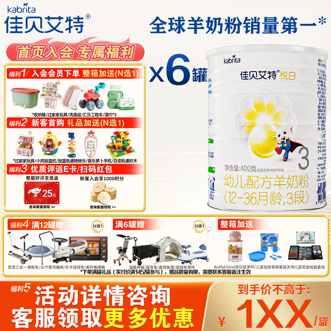 佳贝艾特(Kabrita)悦白幼儿配方羊奶粉3段(1-3岁)荷兰原装进口 400g*6罐(咨询优惠价)