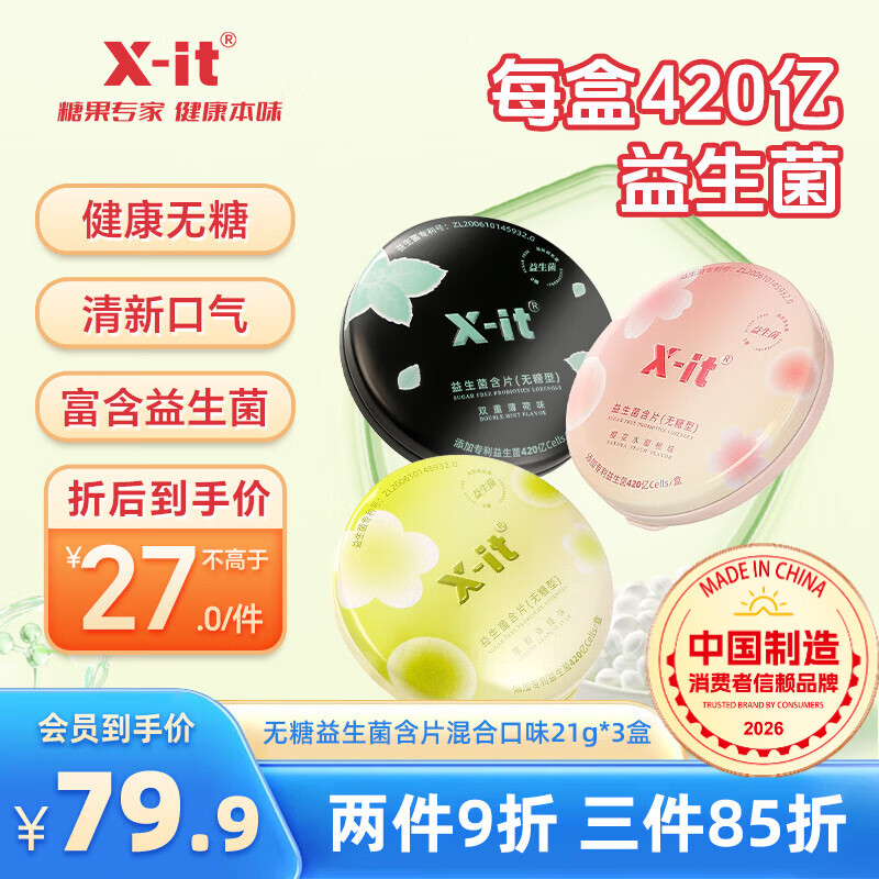 X-IT 无糖益生菌含片 混合口味21g*3 富含益生菌 薄荷糖 去除口腔异味