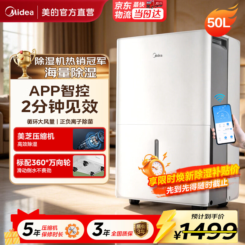 美的(Midea)除湿机 50升家用智能抽湿机 正负离子空气净化卧室烘干去湿机防潮干燥机地下室别墅商用工业吸湿器 50L/天 70-120㎡