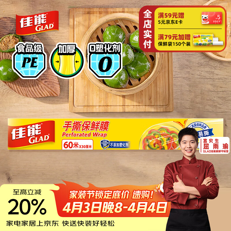 佳能(Glad)食品级保鲜膜点断式60米 家用保鲜膜套大号生鲜水果保鲜 PW60M