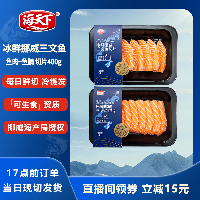 海天下冰鲜挪威三文鱼刺身 鱼腩双拼切片 净重400g【生食资质】源头直发