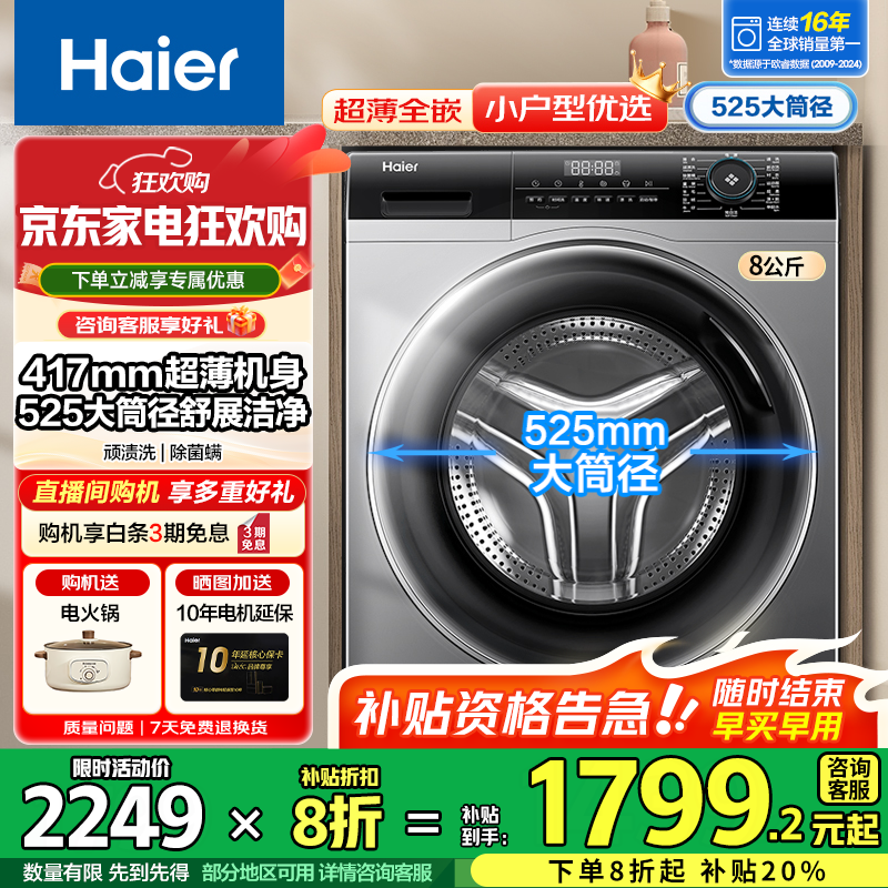 海尔(Haier)【行业超薄TOP】海尔8/10公斤超薄滚筒洗衣机全自动家用小户型嵌入式一级能效大筒径国家补贴 8公斤+417超薄+525大筒径+除菌螨+羽绒洗