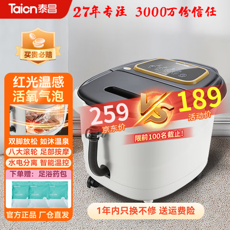 泰昌(Taicn)通电泡脚桶恒温加热足浴桶按摩足浴盆洗脚桶洗脚盆泡脚盆活氧气泡红光温感TC-9082【脚动非电动】 TC-9082丨红光气波功能丨智能温控