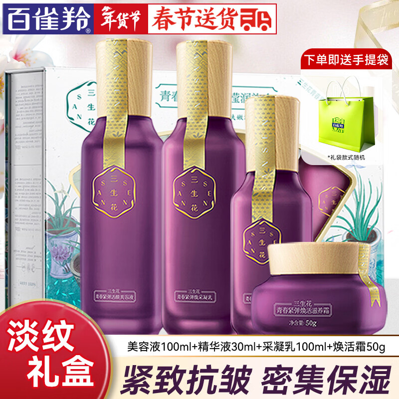 百雀羚(PECHOIN)三生花套装女 紧致抗皱淡纹保湿妈妈水乳套装40-60岁护肤品礼盒物 水+乳+霜+精华【淡纹礼盒】