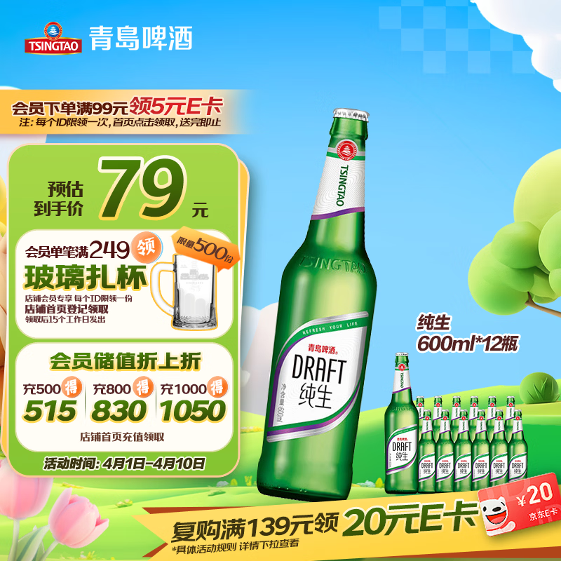 青岛啤酒(TsingTao)鲜活纯生原麦汁浓度8°P整箱装 600ml*12瓶 肖战同款踏春送礼