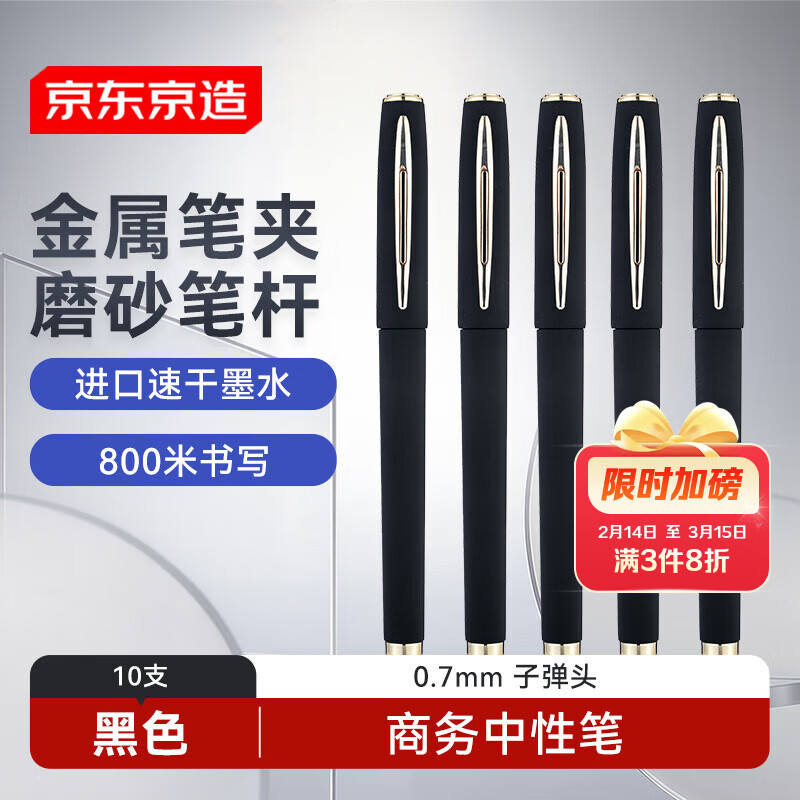 京东京造商务中性笔0.7mm黑色10支装 子弹头大容量拔帽签字笔办公会议1200米书写JD1051