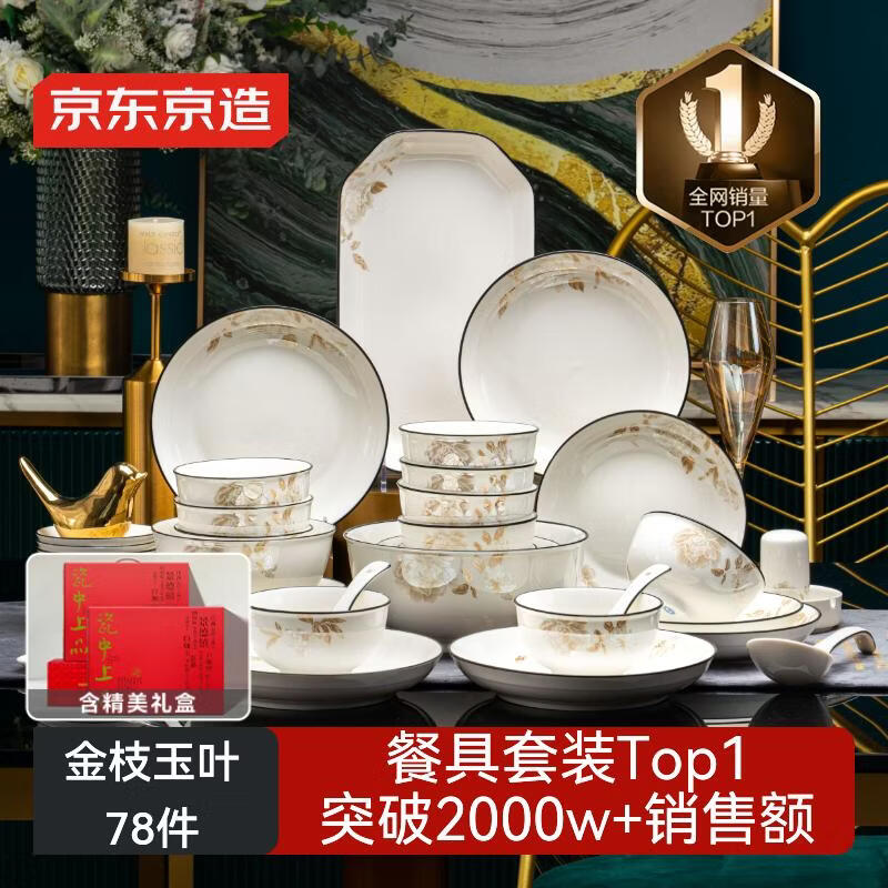京东京造 碗盘餐具整套 景德镇碗具碟子套装乔迁之喜陶瓷礼盒金枝玉叶78头