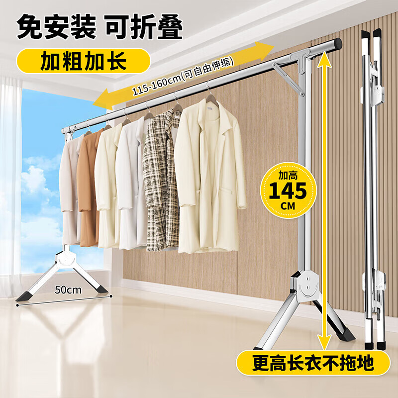 京佳宜落地晾衣架【免安装伸缩1.6米】室内阳台晒衣架不锈钢折叠晒被架