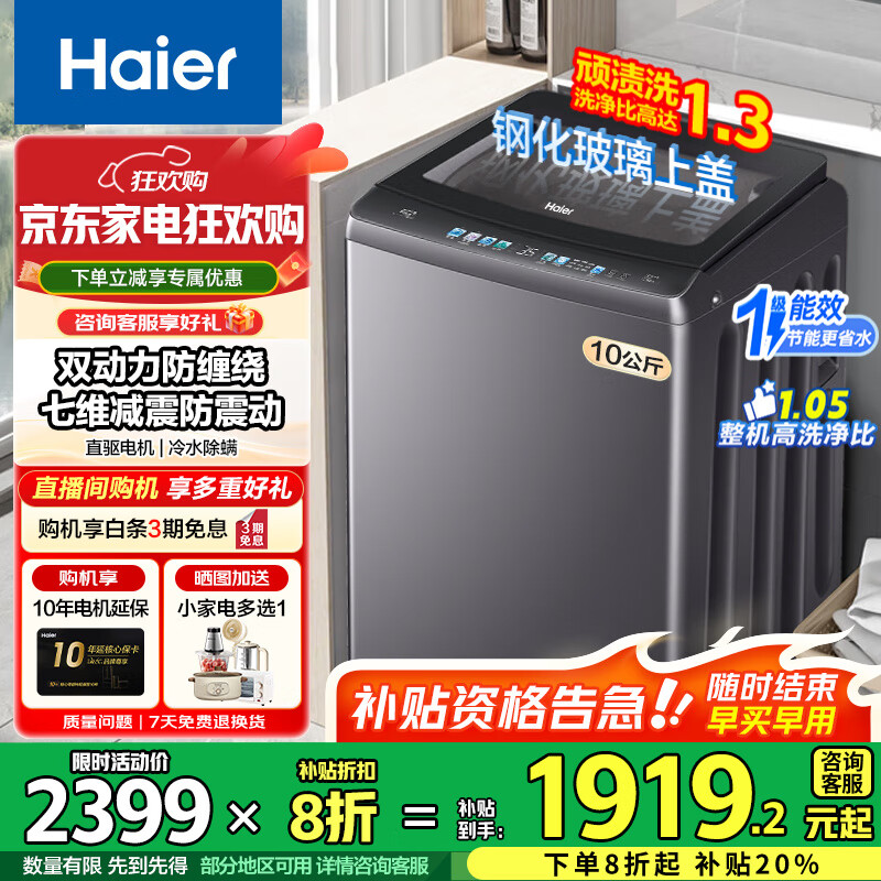海尔(Haier)10公斤双动力波轮洗衣机直驱变频全自动洗衣机防缠绕懒人洗衣机家用出租一级能效省电 10kg+双动力+七维减震+直驱电机+电离除菌