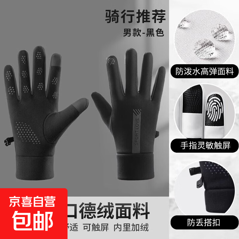 骑行手套男女冬季防风防水加绒保暖秋冬季户外电动车防滑耐磨骑车 德绒/黑色【男款】 全掌防滑/双指触屏