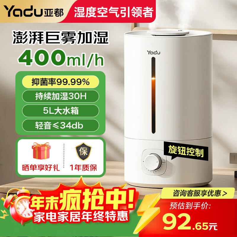 亚都加湿器 家用卧室大雾量 办公室桌面宿舍空调房静音除菌 大容量客厅空气加湿机孕妇婴儿房 小海浪 v5【旋钮款】 400mL/h 5L水箱