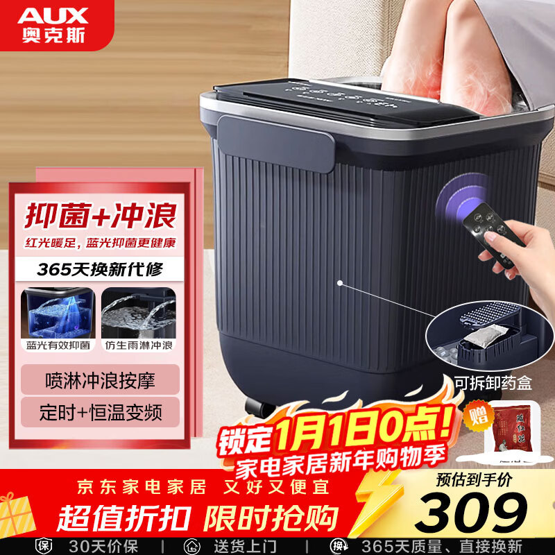 奥克斯(AUX)家用泡脚桶足浴盆50A1615 抑菌躺泡免洗电动按摩全自动加热泡脚盆 元旦新年礼物