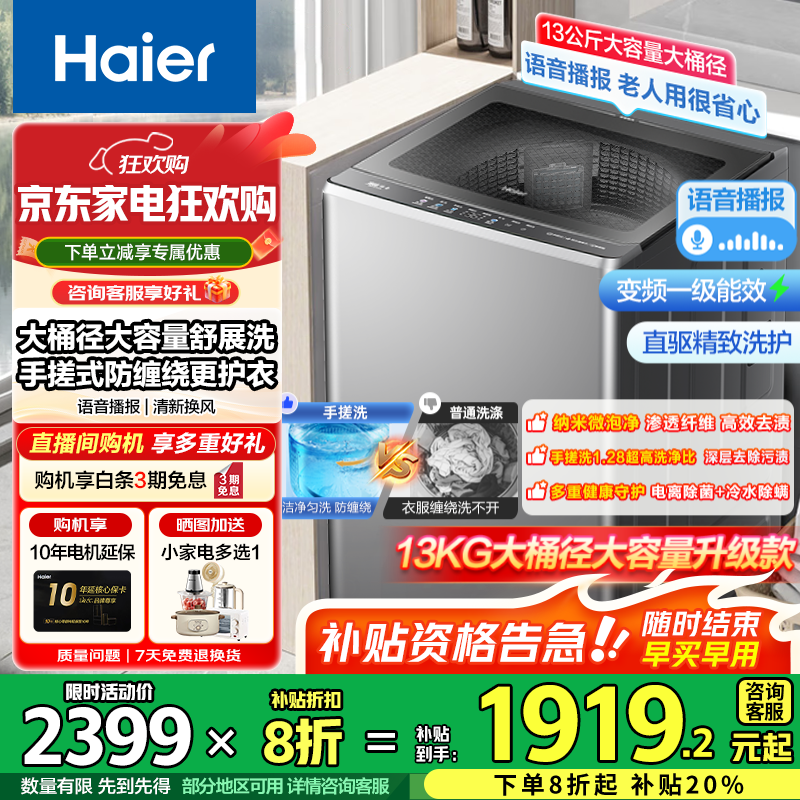 海尔(Haier)25年【11/13Kg大容量新品】直驱变频防缠绕波轮洗衣机 全自动家用 懒人洗衣机一级能效 13KG+手搓洗净比1.28+494mm桶径+语音