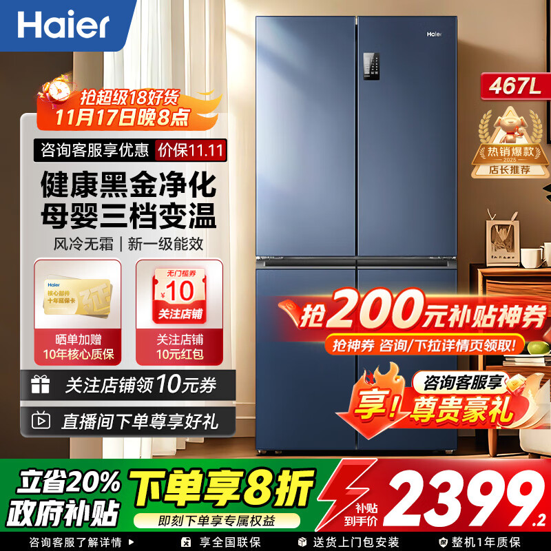 海尔(Haier)【国家补贴20%】467L超薄十字四开门多门冰箱一级能效变频双循环三档变温专属母婴空间家用电冰箱 467升|黑金净化|三挡变温空间