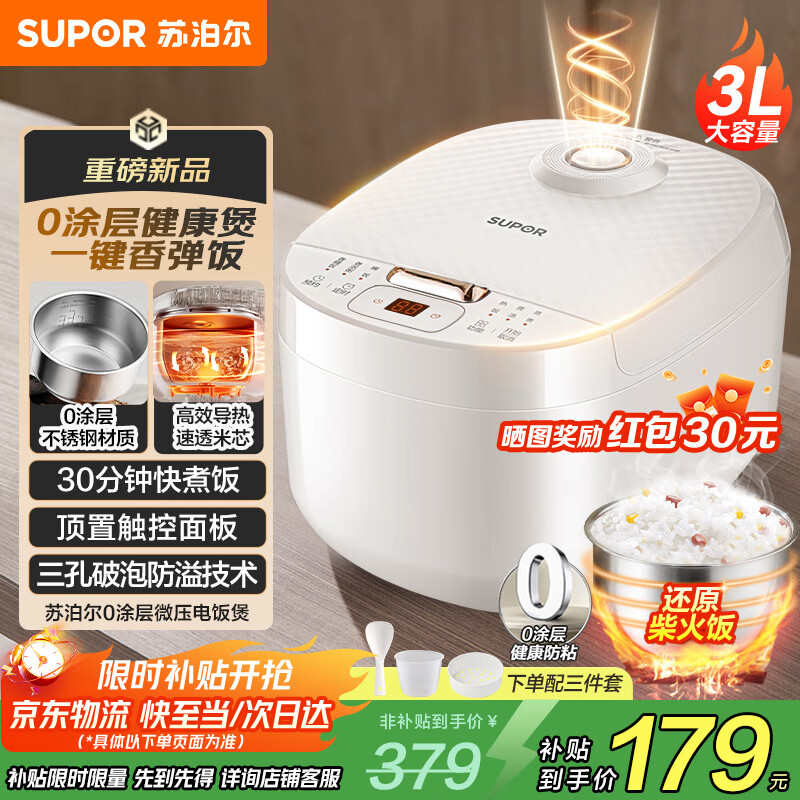 苏泊尔(SUPOR)电饭煲家用3L家庭容量0涂层不锈钢迷你电饭锅2-3人智能防溢多功能煲汤煮粥锅 SF30FC2157S [0涂层不锈钢】智能迷你微压 3L