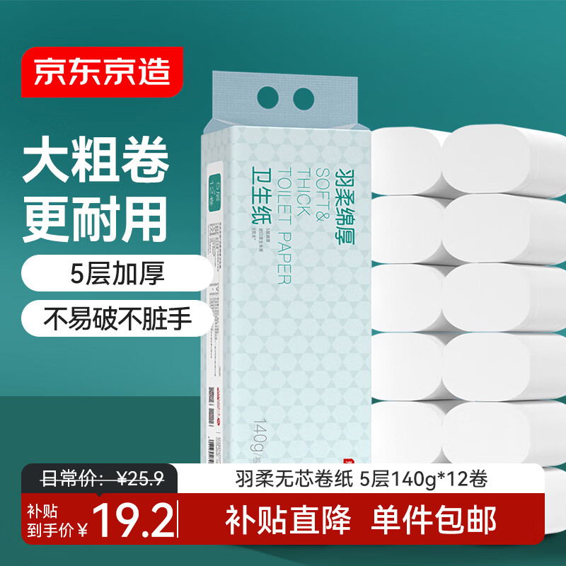 京东京造 羽柔绵厚 无芯卷纸【5层加厚】140g*12卷提装 卫生纸巾厕纸
