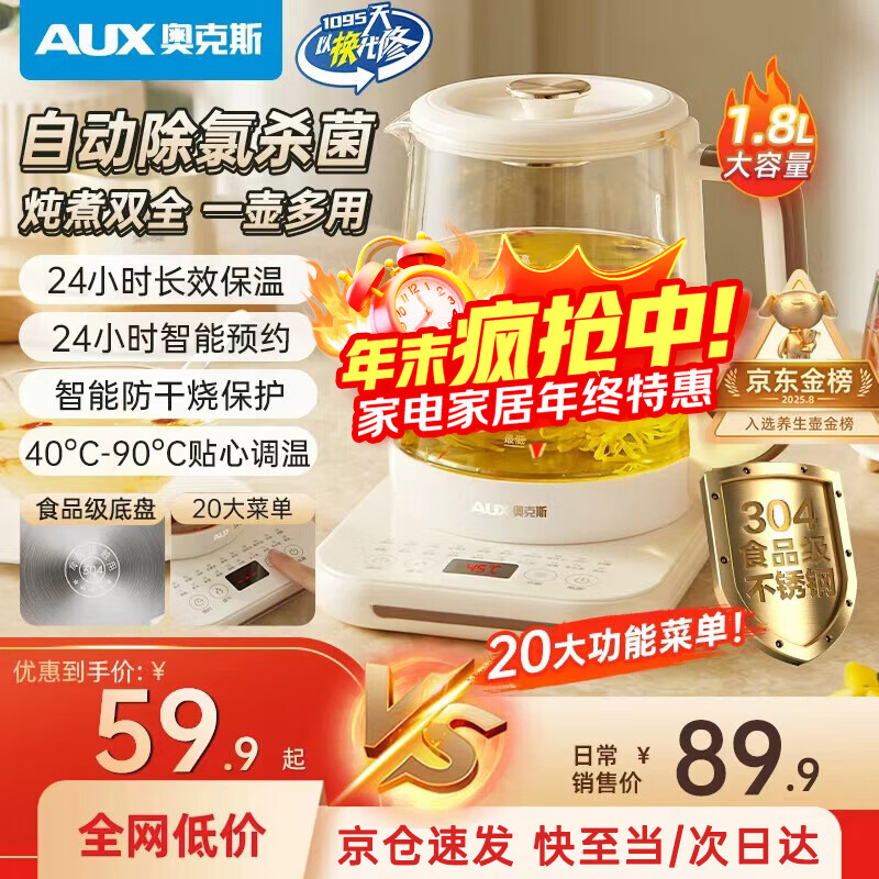 奥克斯养生壶炖煮壶一体煮茶器煮茶壶家用烧水壶玻璃恒温水壶迷你办公室用二合一宿舍保温全自动2025新款 【食品级304】高硼硅玻璃 1.8L