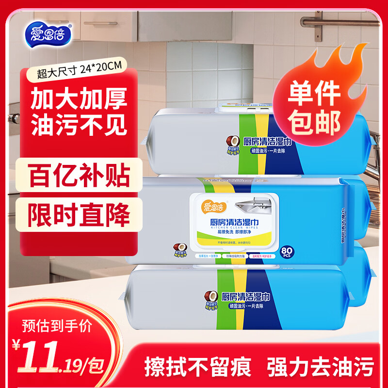 爱恩倍厨房用纸 去油污厨房湿巾80抽*5包 懒人抹布油烟机清洁加大不伤手