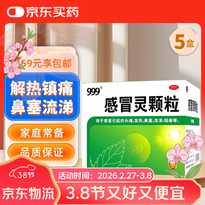 999三九感冒灵颗粒10g*9袋5盒装感冒药解热镇痛用于感冒引起的头痛发热鼻塞流涕咽痛缓解感冒症状