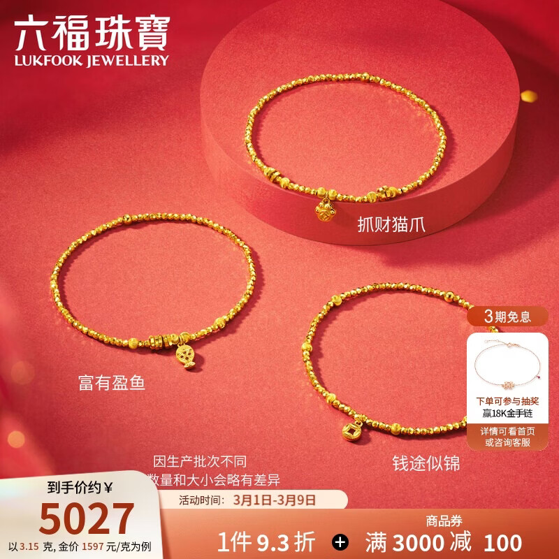 六福珠宝新年礼物黄金手链富有盈鱼足金金珠财福盈余手串 计价 约3.15克