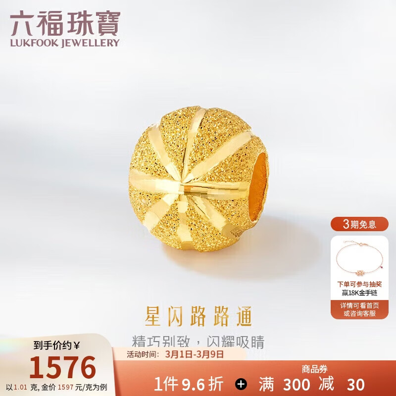 六福珠宝38节礼物 足金星闪黄金转运珠路路通串珠 计价 约1.01克