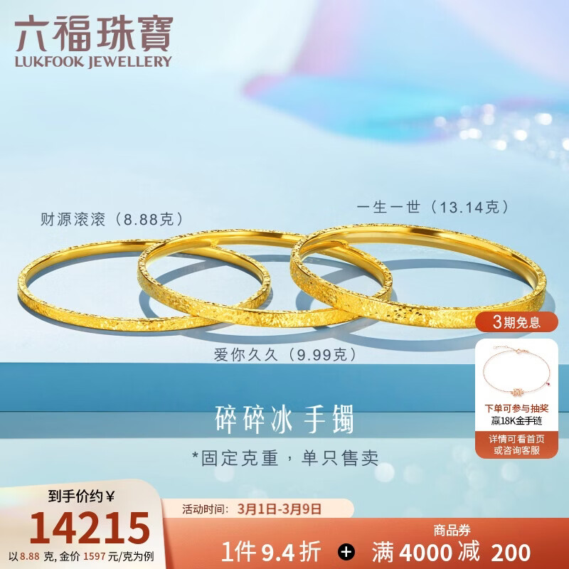 六福珠宝 财源滚滚黄金手镯光影金足金碎碎冰38节礼物计价 58mm-约8.88克