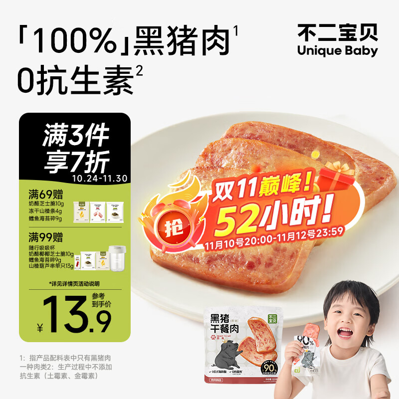 不二宝贝 儿童黑猪午餐肉无蔗糖 儿童宝宝零食搭配宝宝罐头120g单独6片