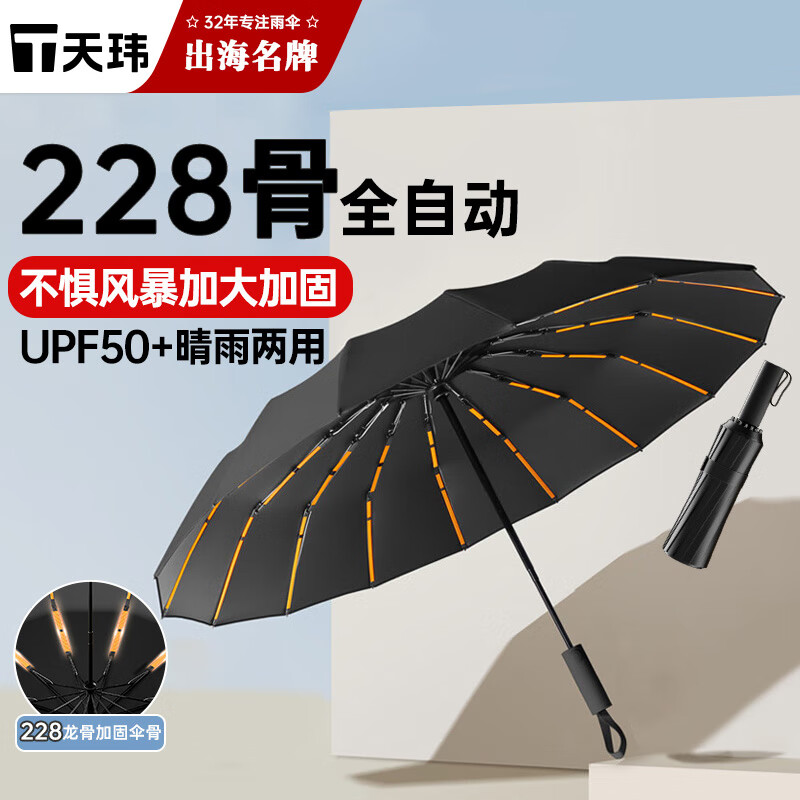天玮伞业全自动雨伞大号加固加厚抗风黑胶防晒晴雨两用折叠228骨可定制
