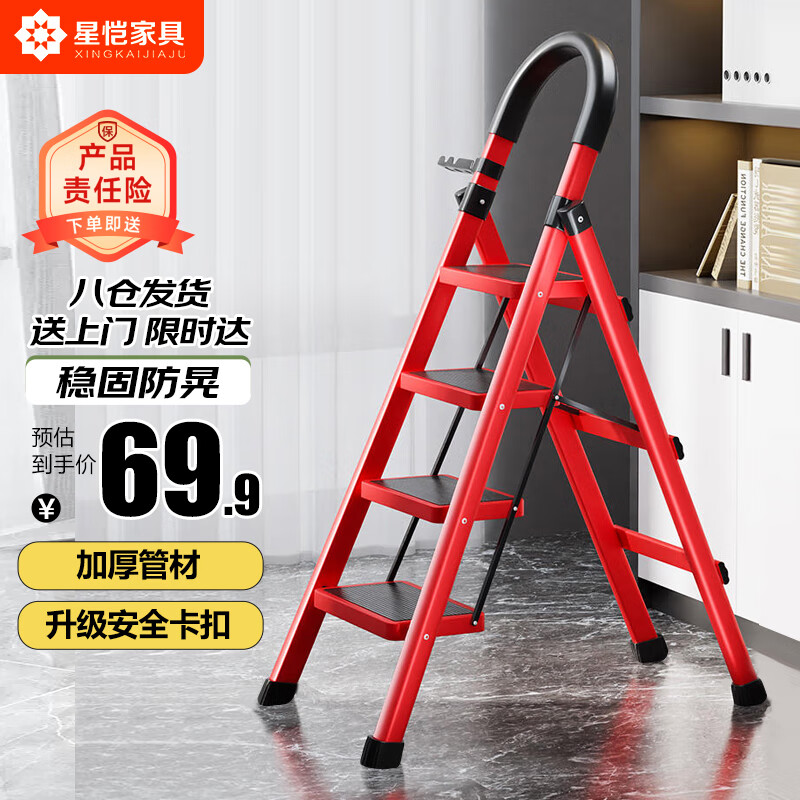 星恺梯子家用折叠梯人字梯多功能登高爬梯扶梯小梯子TZ10四步红