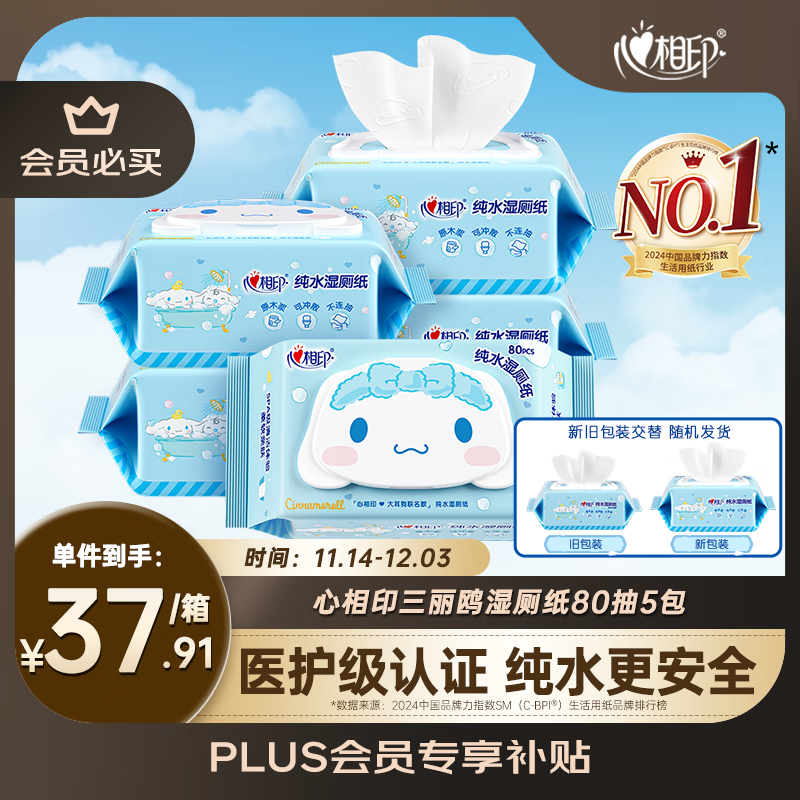 心相印【田栩宁推荐】三丽鸥湿厕纸80片*5包 温和洁净大耳狗款包装随机