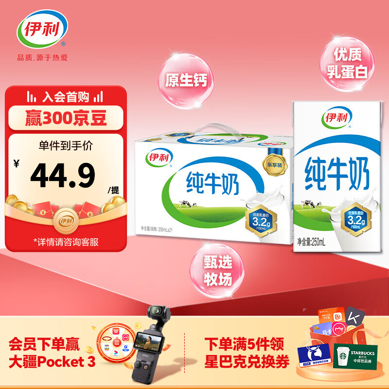 伊利纯牛奶250ml*21盒/箱 全脂牛奶 优质乳蛋白 礼盒装