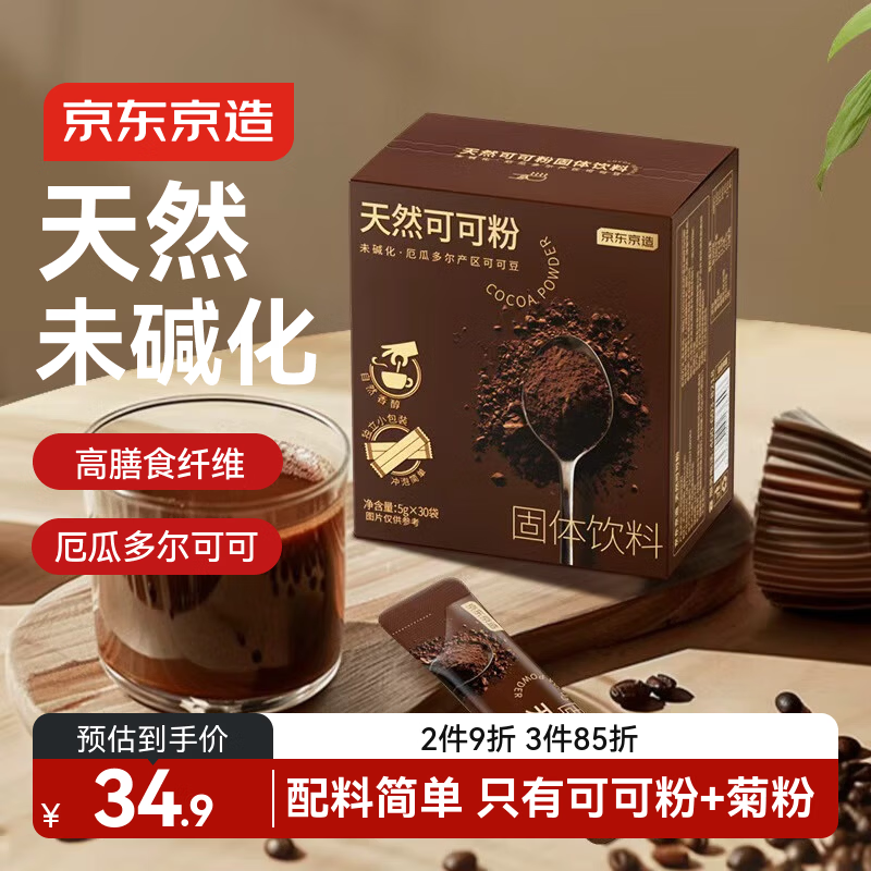 京东京造天然生可可粉150g(5g*30袋)未碱化烘焙热巧克力冲饮小包装