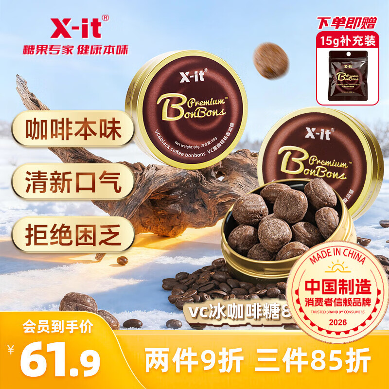 X-IT 冰咖啡糖 88g*2+15g补充装 润喉糖 冰美式开车醒神 草本薄荷硬糖