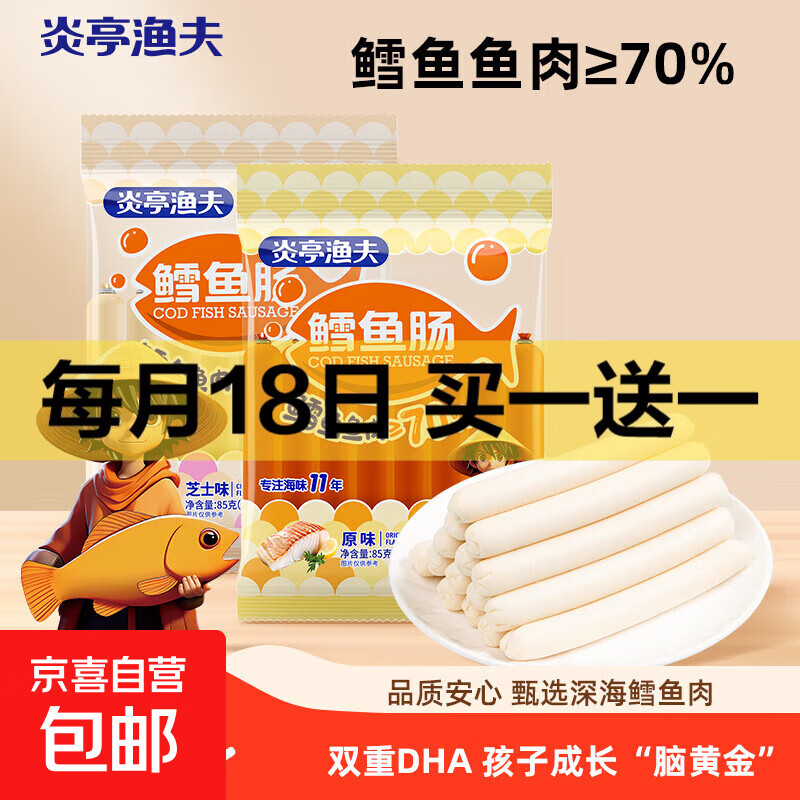 炎亭渔夫鳕鱼肠85g原味芝士味无添加鱼零食海味休闲儿童火腿肠 芝士味85g*1袋(10根)