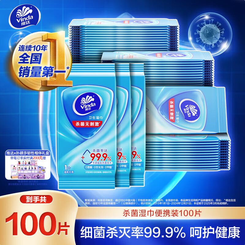 维达(Vinda)杀菌湿巾10片*10包 湿巾小包独立便携装杀菌率99.9%无酒精 湿纸巾