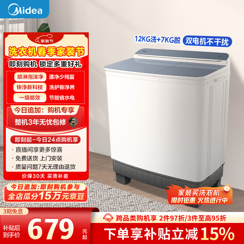 美的(Midea)双桶洗衣机半自动 12公斤大容量 双缸 一级能效 MP12S166 以旧换新 补贴 京东自营官方旗舰