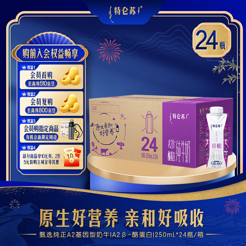 特仑苏A2β-酪蛋白纯牛奶梦幻盖250mL×24瓶【亲和肠胃 易吸收】A2牛奶