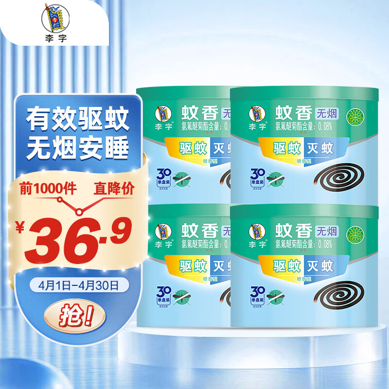 李字 蚊香30单盘*4装无烟檀香型超效灭蚊客厅厕所去味驱蚊基孔肯雅热