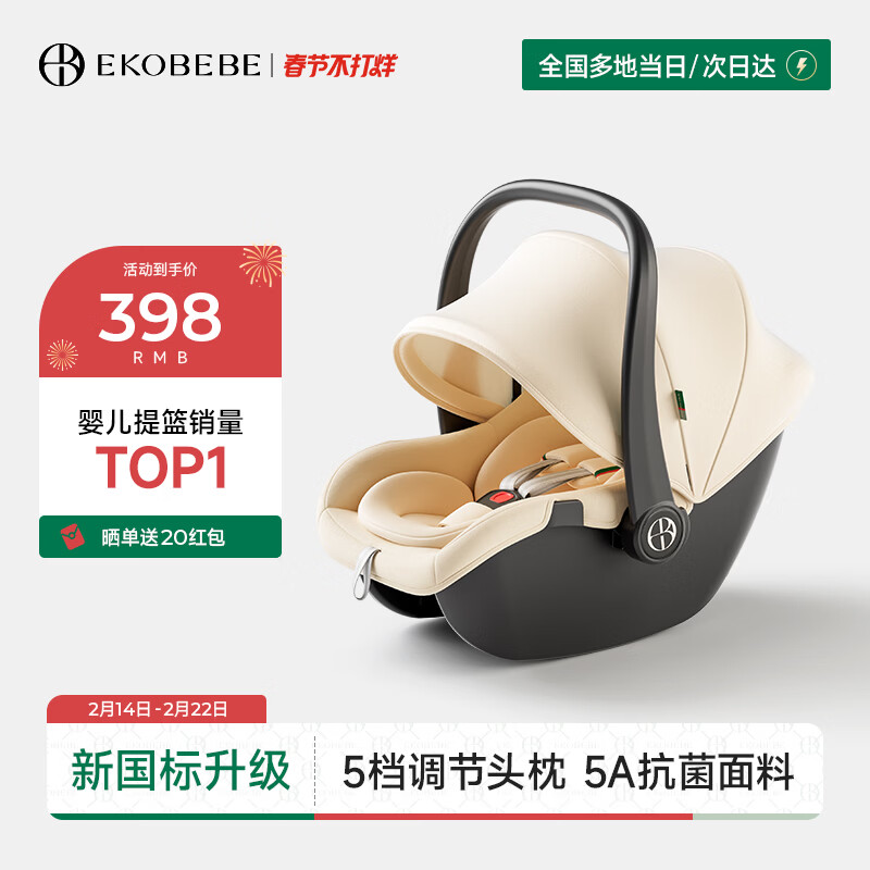 怡戈(Ekobebe)小元宝新生婴儿提篮式儿童安全座椅汽车用宝宝便携车载提篮奶酪白
