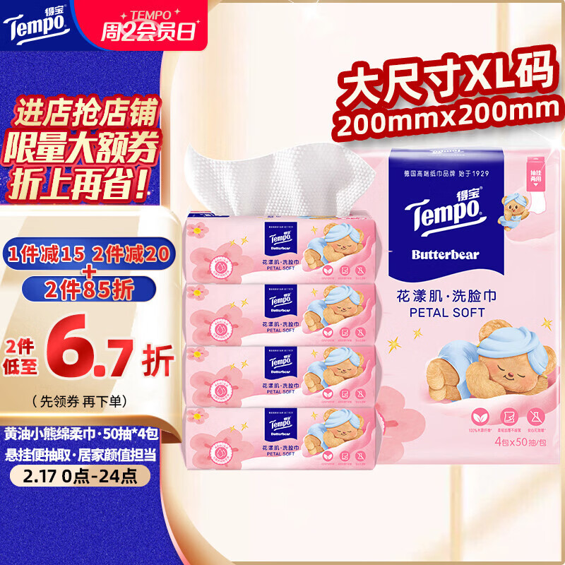 得宝(TEMPO)黄油小熊联名款 悬挂洗脸巾50抽*4包 一次性毛巾 XL码绵柔巾婴儿