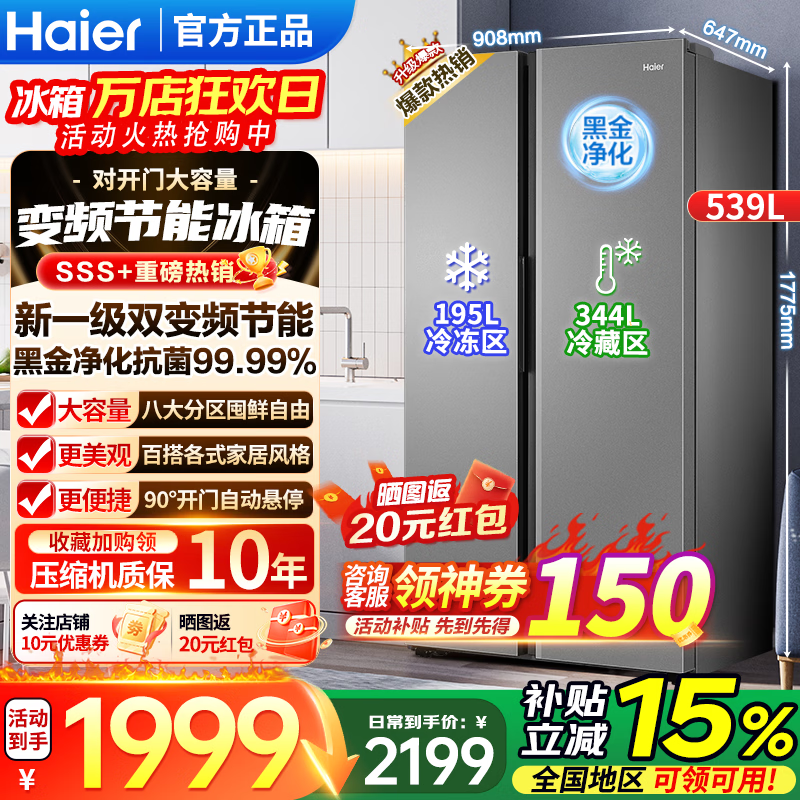 海尔(Haier)风冷无霜冰箱双开门539升一级能效节能变频对开门冰箱家用家电以旧换新电冰箱黑金抗菌净味 海尔539升双变频+黑金净化抗菌+90°开门悬停