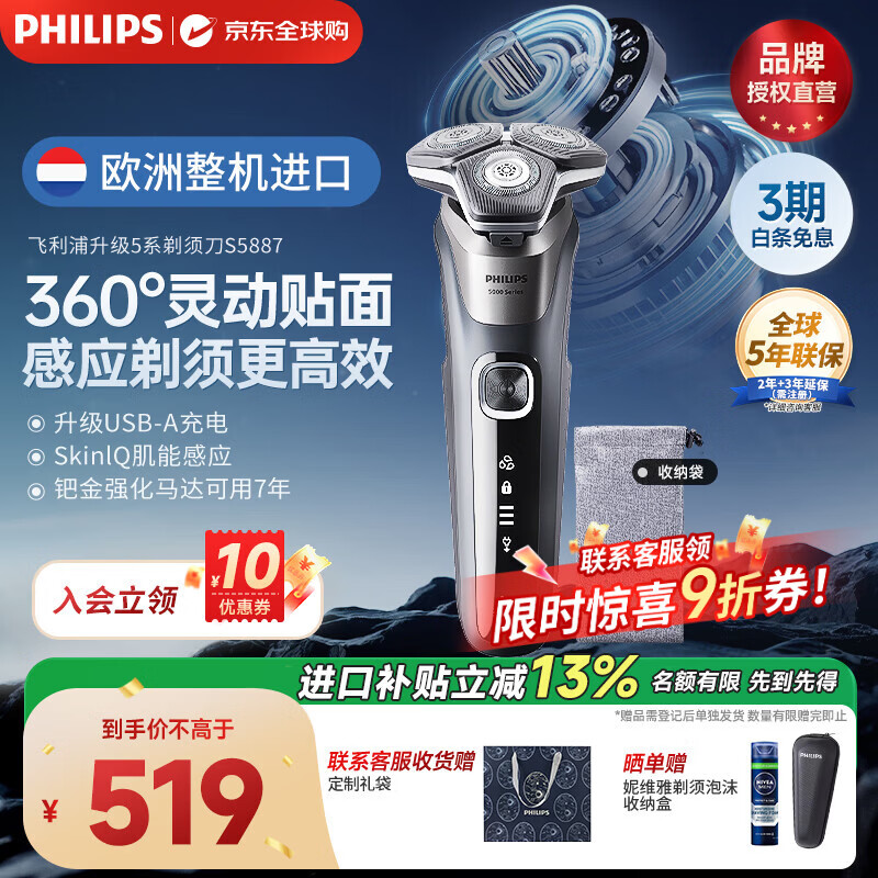 飞利浦(PHILIPS)电动剃须刀刮胡刀 欧洲整机进口 经典蜂巢旋护5系 SkinIQ智能感应 生日礼物商务送礼送老公送长辈 【热销爆款】旋护5系Pro S5887/10