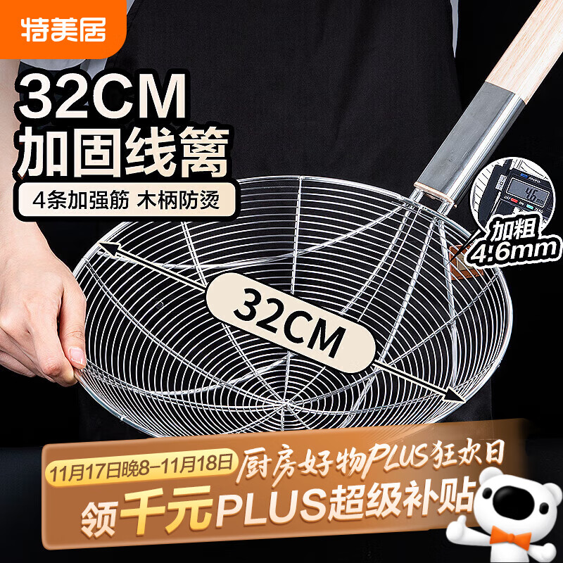 特美居不锈钢漏勺过滤细网笊篱密漏勺网筛家用长柄捞面漏勺大号商用32cm