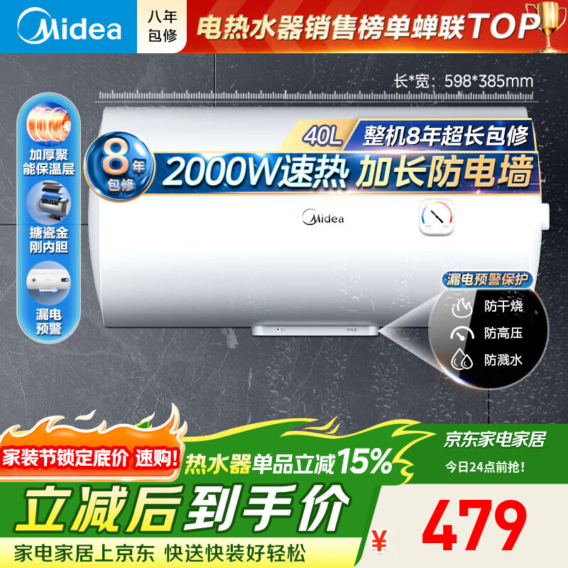 美的(Midea)【有奖发票】储水式电热水器家用洗澡速热出租屋节能省电免费上门安装小型家电安全防漏电防电墙 40L 2000W 1-2人洗【防电墙】