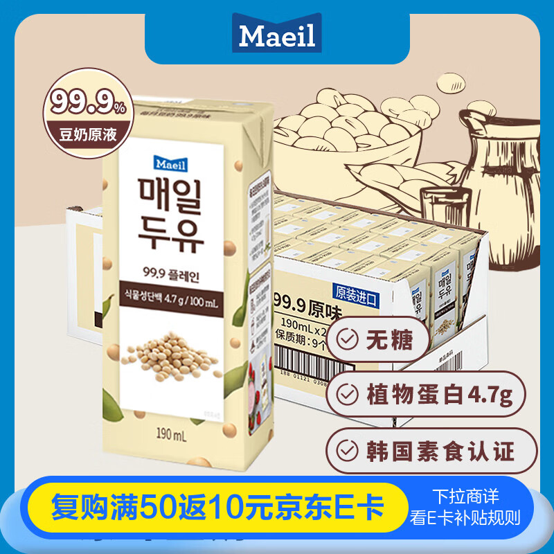 Maeil每日韩国进口无糖99.9%原味豆奶190ml*24盒 0乳糖0蔗糖植物蛋白