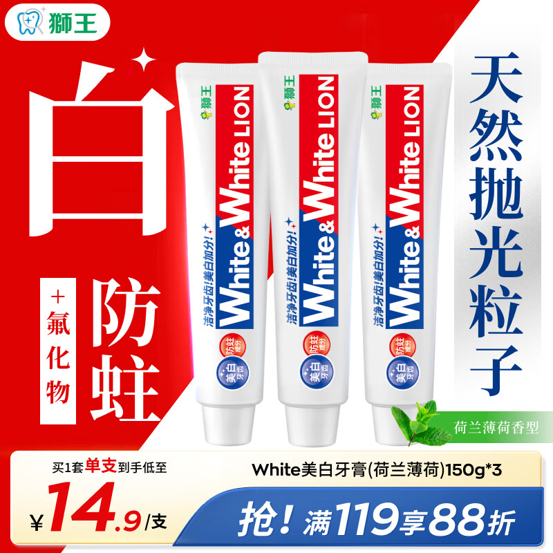 狮王(Lion)Whitewhite进口美白牙膏荷兰薄荷150g×3大白管去黄去牙渍